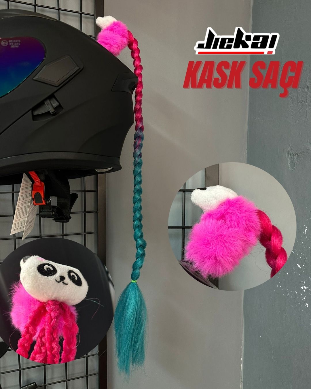 Tokalı pembe mavi geçişli düz örgü uzun kask saçı stoklarda. Pembe ve mavinin uyumlu renk geçişi ile tokalı tasarım birleşerek kaska takıldığında modern, şık ve dikkat çekici bir görünüm sunar. Farklı, enerjik ve iddialı bir stil isteyen sürücüler için özel üretimdir.