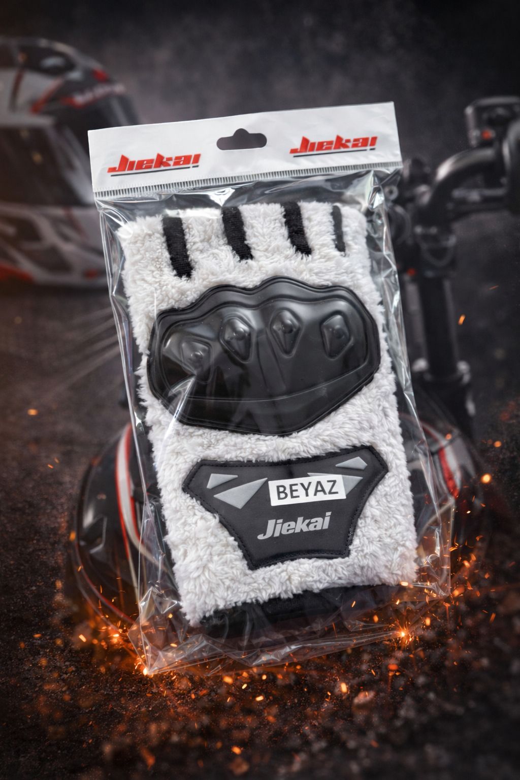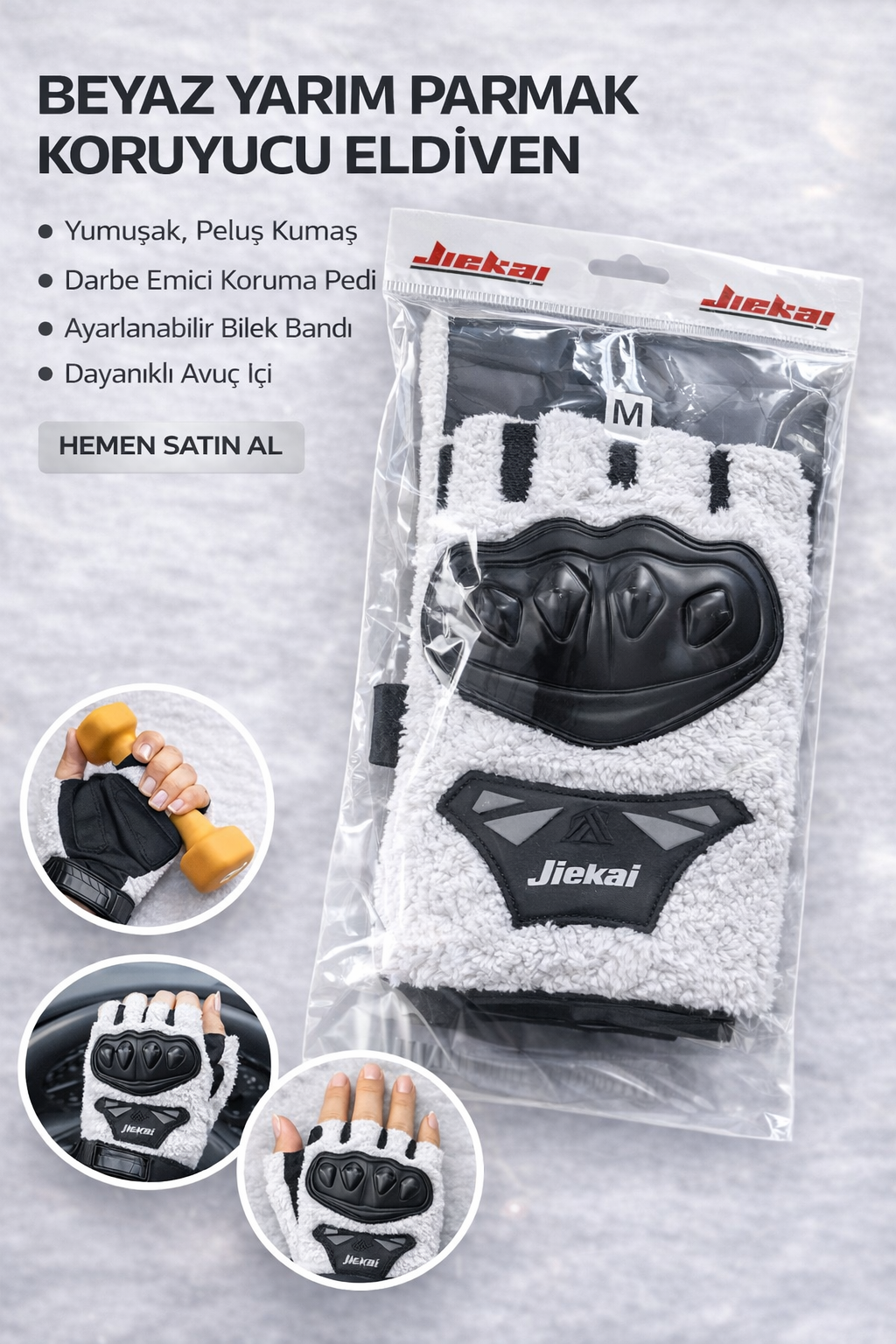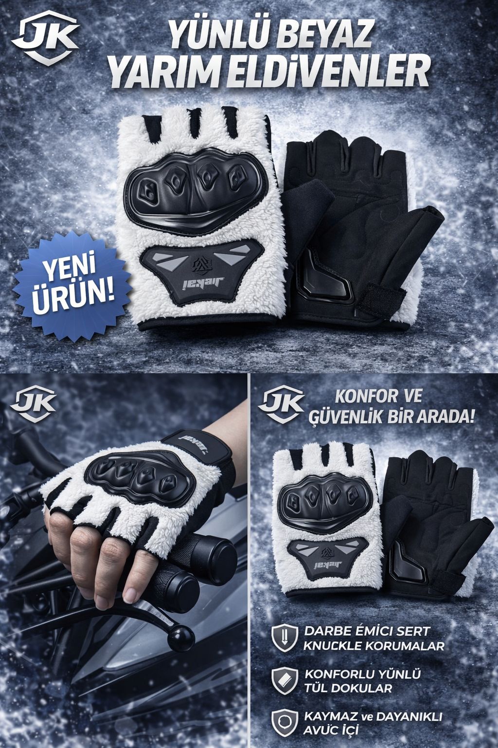 JK Peluşlu Yarım Eldiven, soğuk ve rüzgârlı havalarda konforu ön planda tutan kullanıcılar için özel olarak tasarlanmıştır. Yumuşak peluş dokusu ve sade beyaz rengi ile hem şık hem de fonksiyonel bir kullanım sunar. Günlük kullanım ve motosiklet sürüşleri için ideal bir üründür.