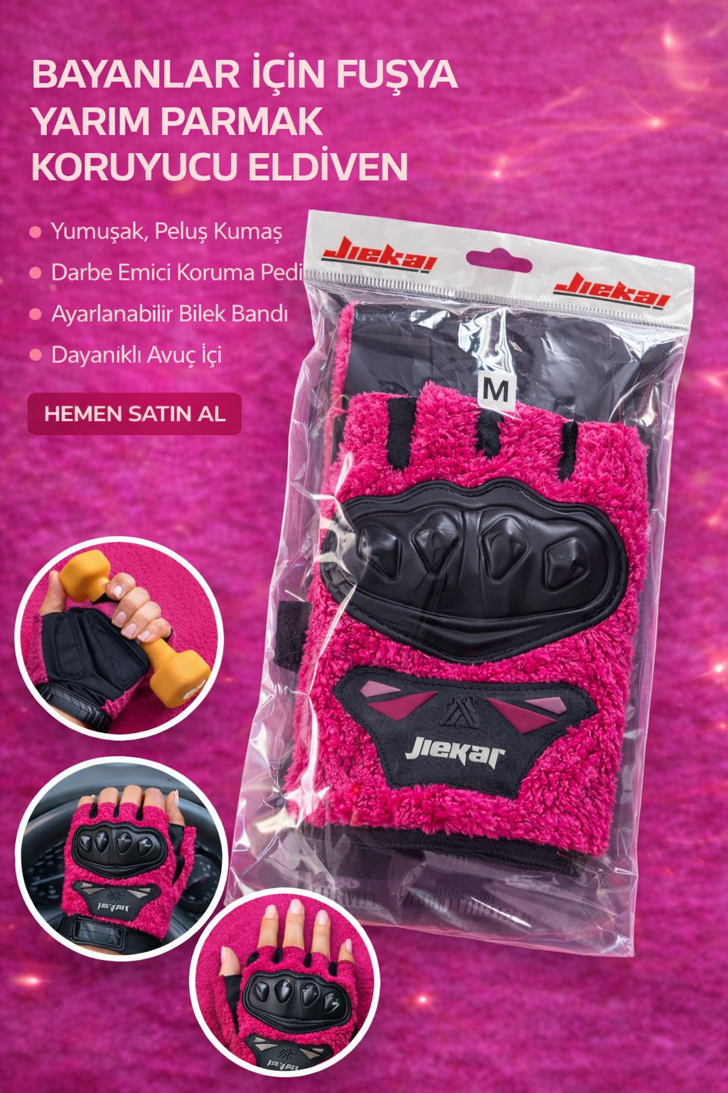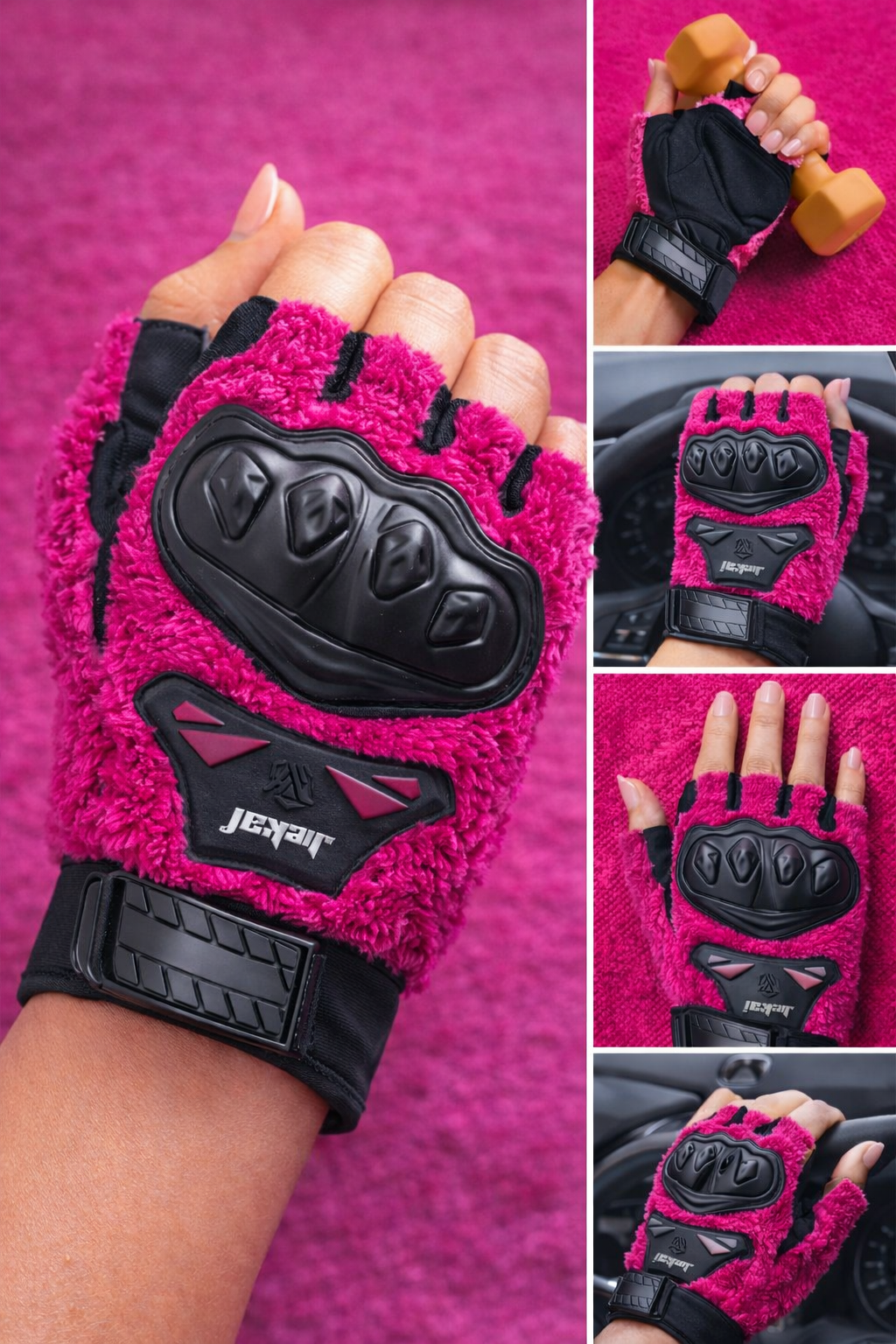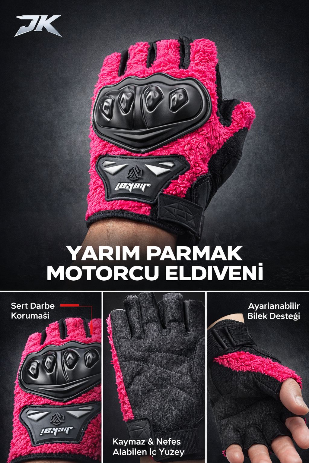 JK Peluşlu Yarım Eldiven, soğuk havalarda konforu artırmak, sürüş sırasında sıcaklığı korumak ve stilinden ödün vermek istemeyen kullanıcılar için özel olarak tasarlanmıştır. Canlı ve enerjik fuşya rengi sayesinde dikkat çekici bir görünüm sunarken, yumuşak peluş dokusu ile üst düzey konfor sağlar. Günlük kullanım ve motosiklet sürüşleri için ideal bir üründür.